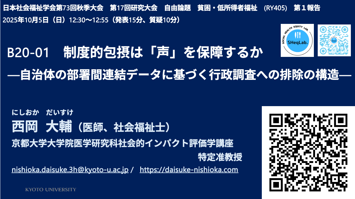 西岡大輔.「医療福祉のエビデンスを作ったらプラクティスが変化した!〜無料低額診療事業を例に〜【研究編】」