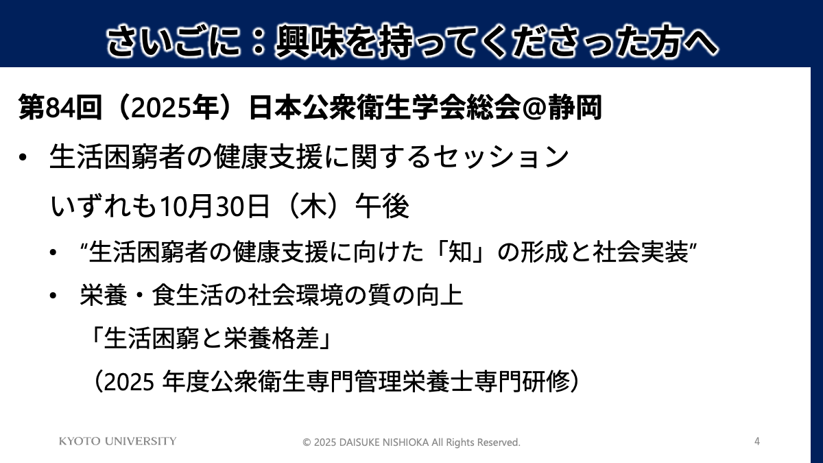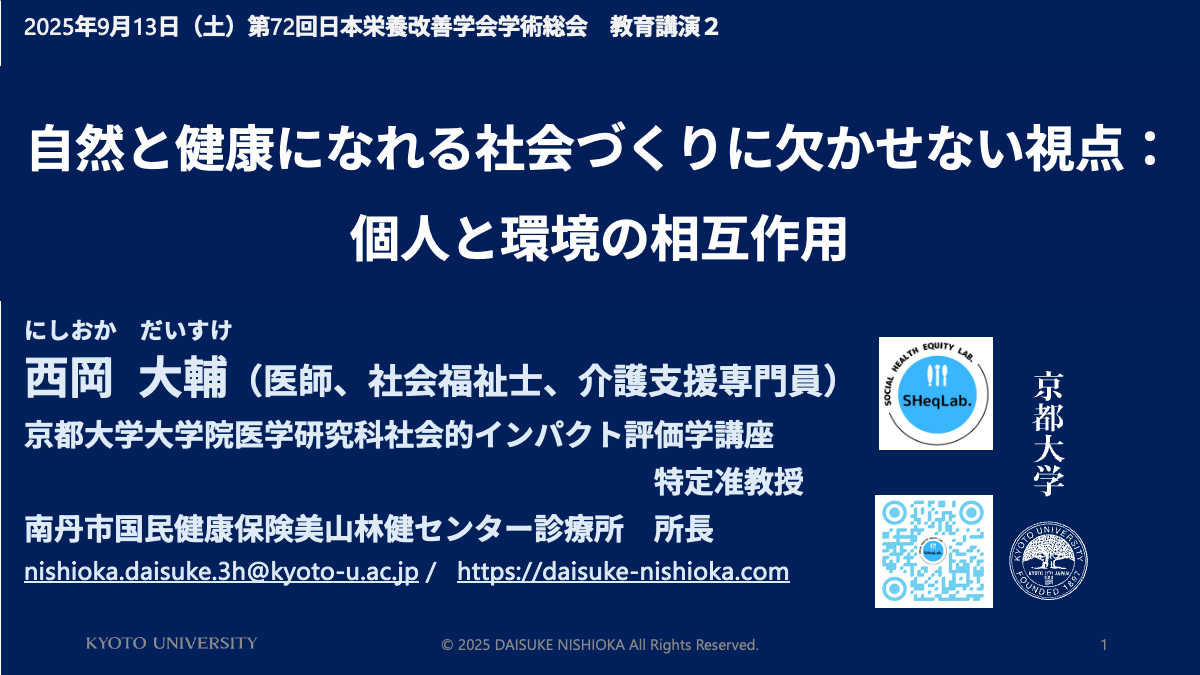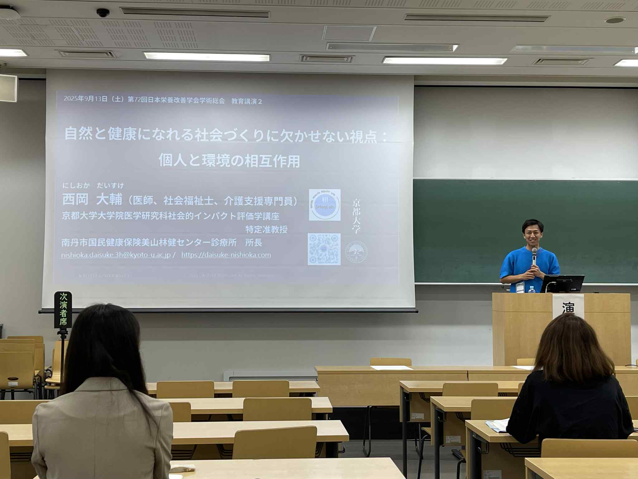 西岡もご縁があり会員として所属している日本栄養改善学会の第72回日本栄養改善学会学術総会(東京農業大学)で、教育講演を務める機会をいただきました。(現在オンデマンド配信中! 申し込み期限は26日まで!)