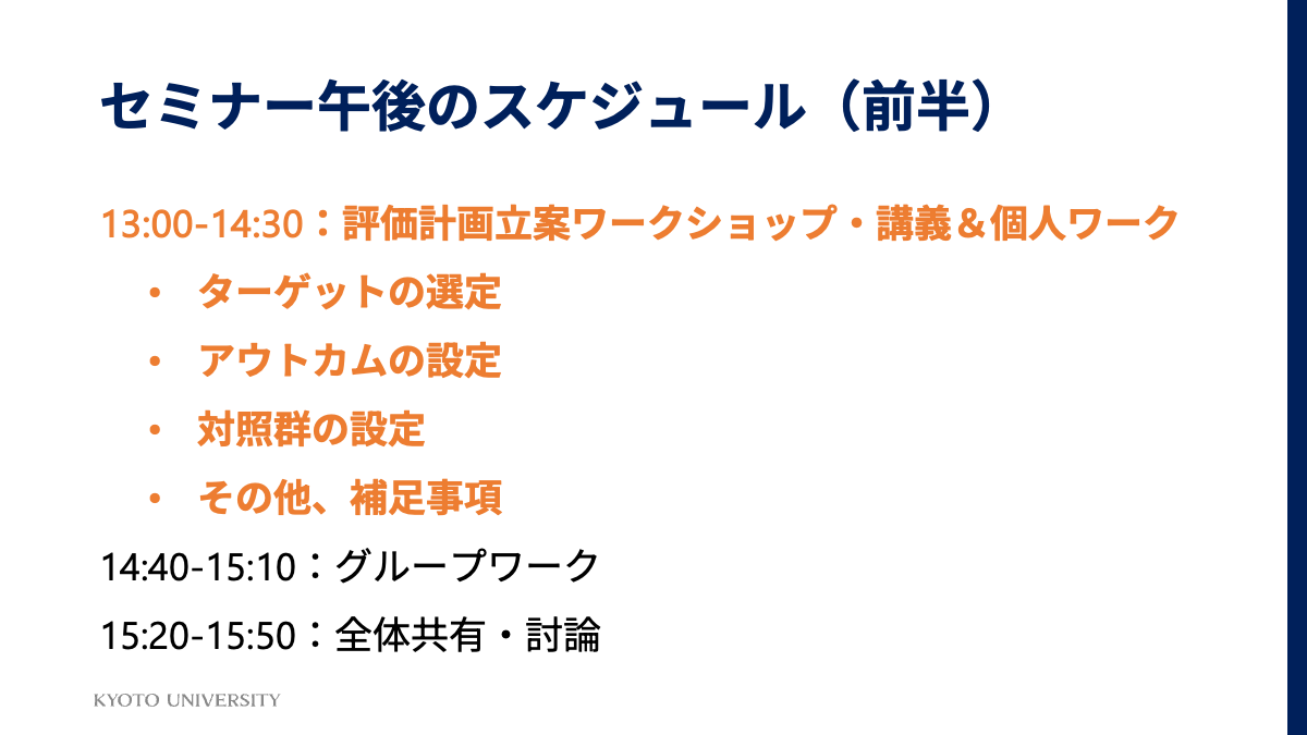 西岡は、評価立案ワークショップを担当し、会場・オンライン参加型の個人ワークおよびグループワークで学び合いました。タイムラインは以下の通りです。