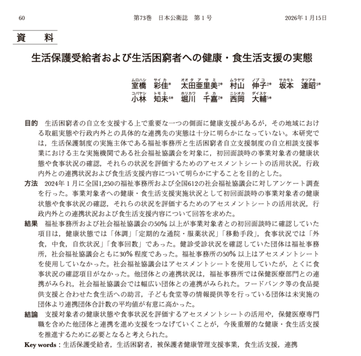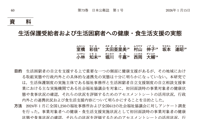 日本国内における生活保護利用者や生活困窮者に対する健康・食生活支援の現状を分析した研究報告が公開・出版されました。生活保護法の被保護者健康管理支援事業や、生活困窮者自立支援法の健康の視点の追加など、生活に困窮している人々の健康支援が政策的にも注目されるようになっている現代社会において、支援に携わりうる機関である全国の福祉事務所および社会福祉協議会の取組実態を調査しました。その調査データを、新潟県立大学の大学院生の方がまとめてくれました!その結果を紹介します。