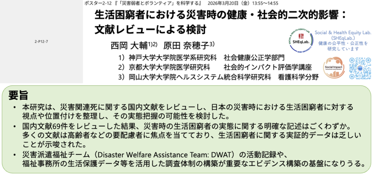災害医学会には初参加です。私はポスターで、生活に困窮する人々の災害時の健康影響がうまく記述されていない現状があることを示唆する文献レビューの結果を報告をしました。